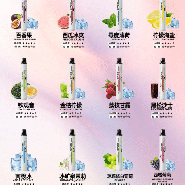 - 口味:冰爽青提、檸檬海鹽、櫻花葡萄、沙士經典、清涼薄荷、秘密百香、至尊紅顏、茉莉綠茶、荔枝甘露、蜜桃氣泡、西瓜冰爽、金桔檸檬、黑加侖糖果、鐵觀音、利賓納