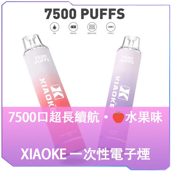 XiaoKe 拋棄式電子煙,8mL 容量,7500 口,650mAh 電池,23 種口味,Type-C 快充。