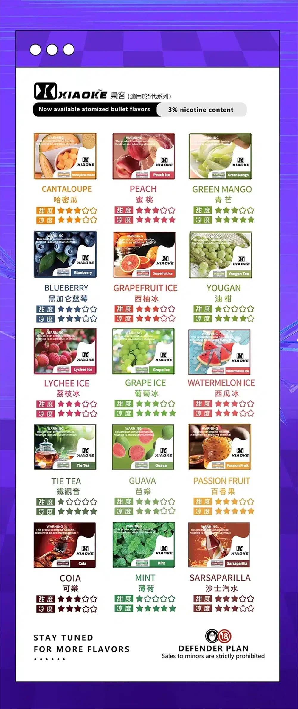 XIAOKE梟客五代電子煙彈,2mL,3%尼古丁,0焦油,多種口味如水果、薄荷、煙草。